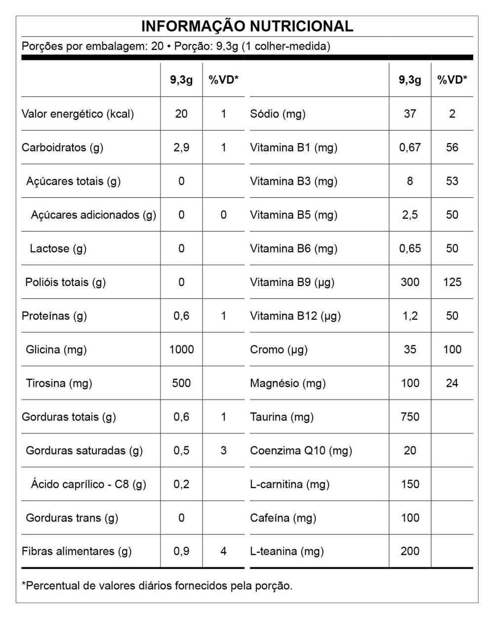 | Porção: 9,3g (1 colher-medida) | 9,3g | %VD* |