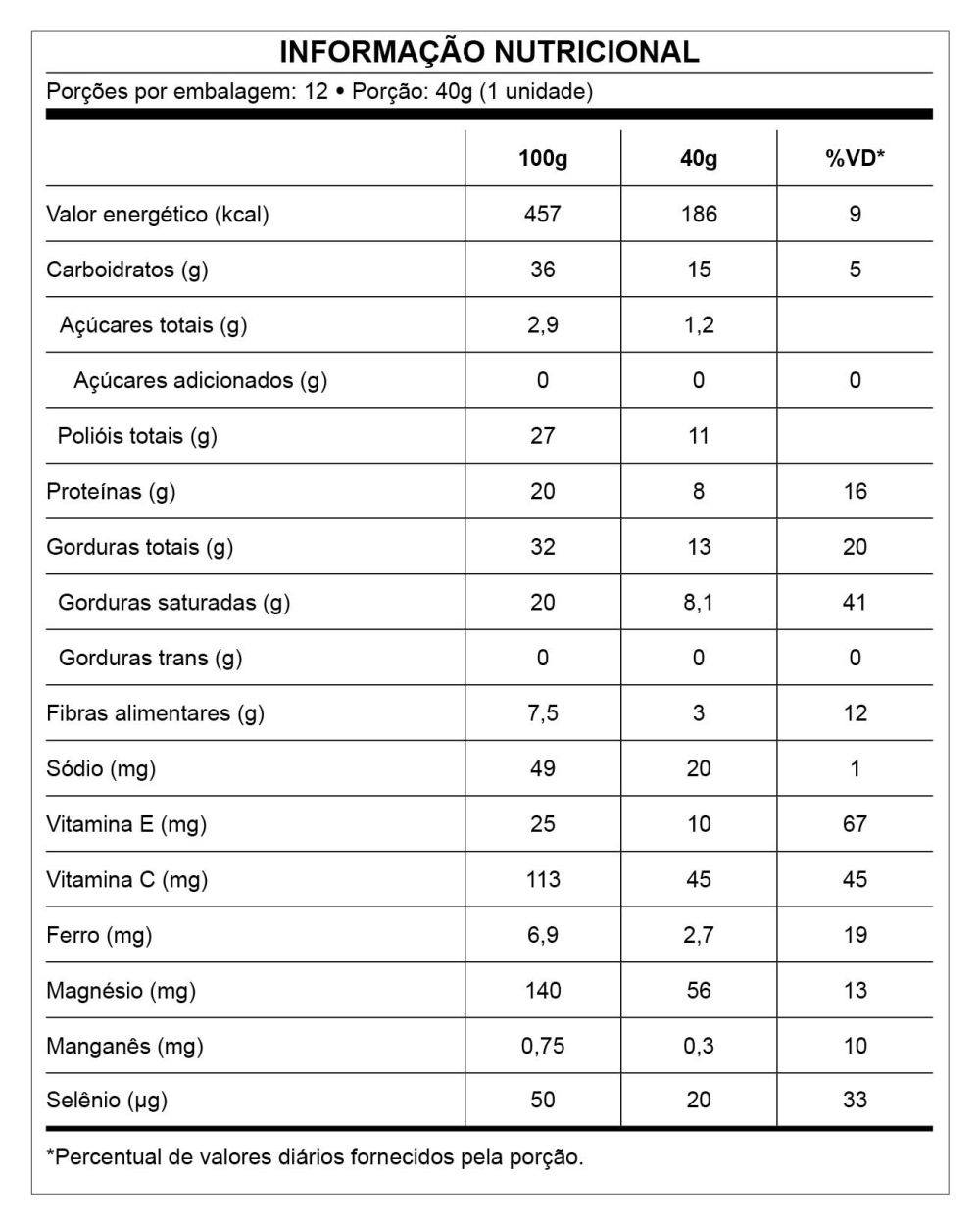 | Porção: 40g (1 unidade) | 100g | 40g | %VD* |
