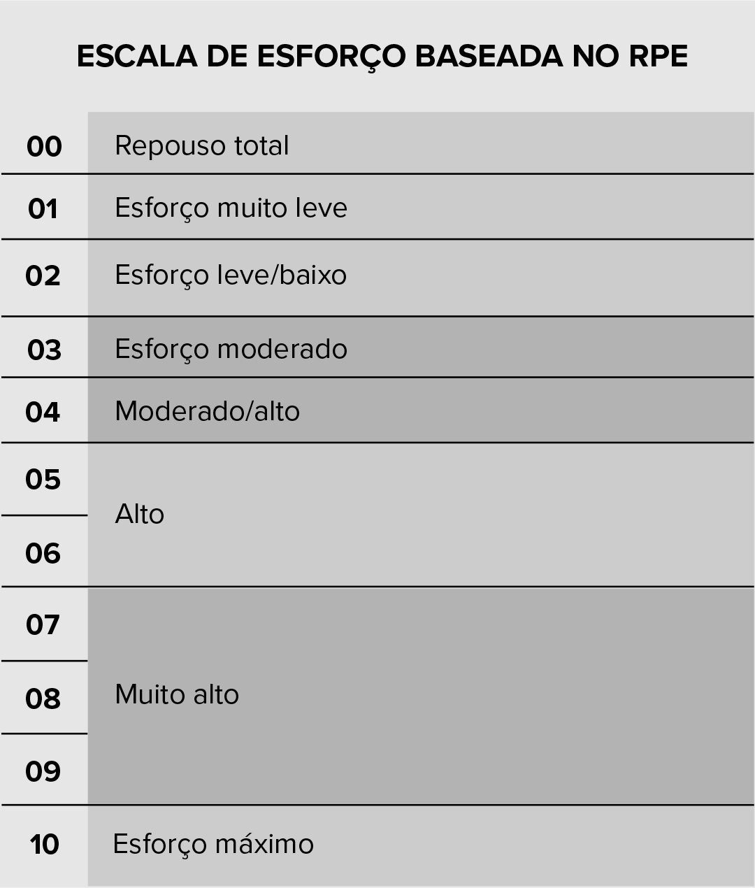 Existe uma ferramenta que ajuda a mensurar o esforço, chamada de percepção subjetiva de esforço (RPE). É uma escala que mede o quão intenso o exercício é, considerando fatores como cansaço, respiração e esforço muscular.