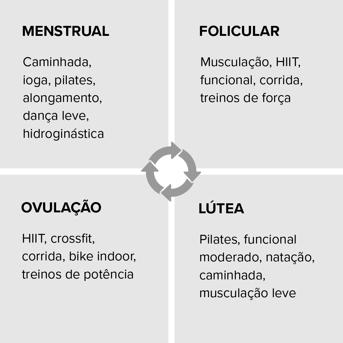 - Ovulação: HIIT, crossfit, corrida, bike indoor, treinos de potência