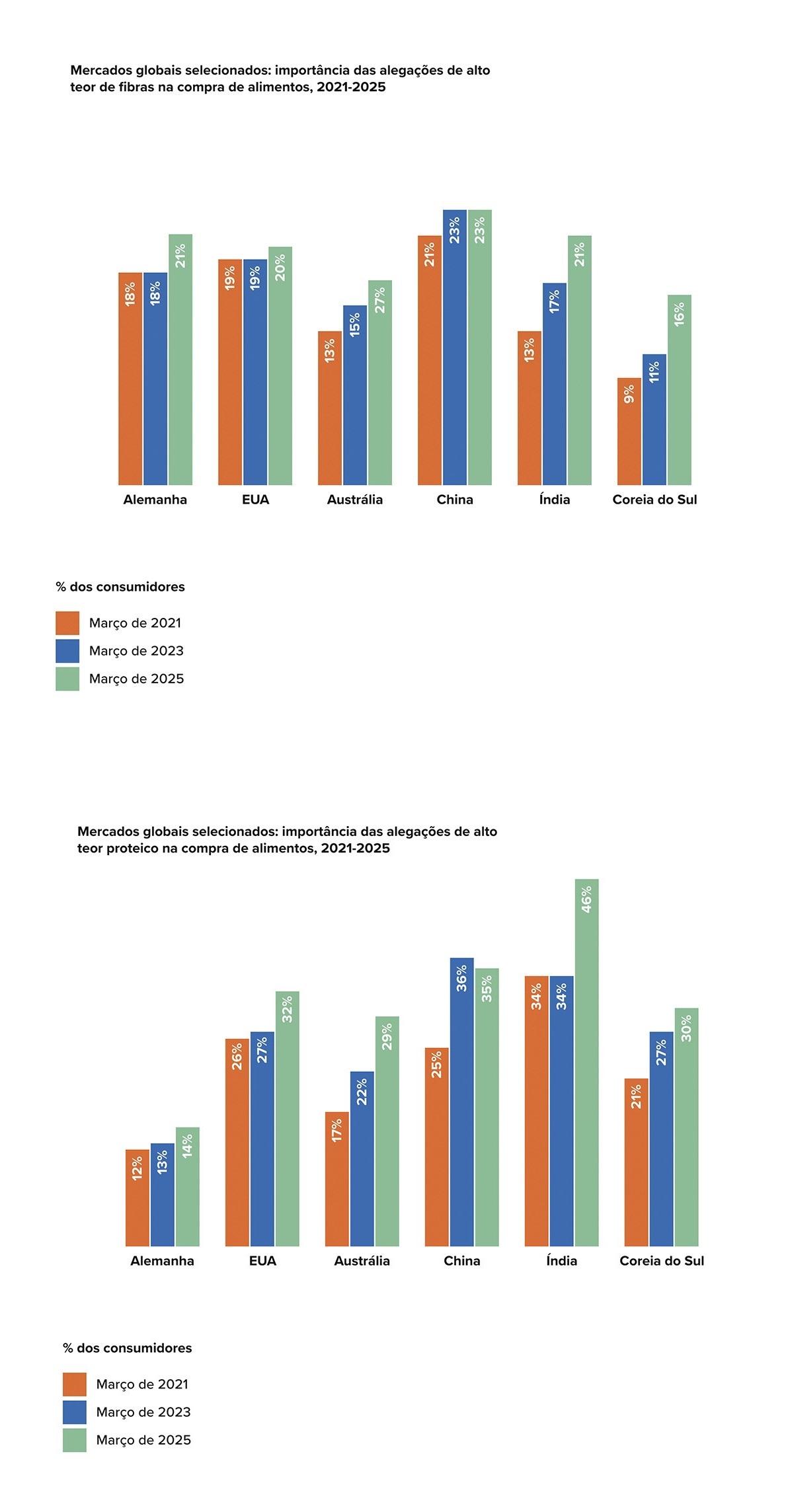 O relatório da Mintel pontua o interesse crescente por alimentos ricos em proteínas e fibras dos consumidores de países importantes para a economia mundial . É interessante acompanhar a evolução entre os anos de 2021 e 2025.