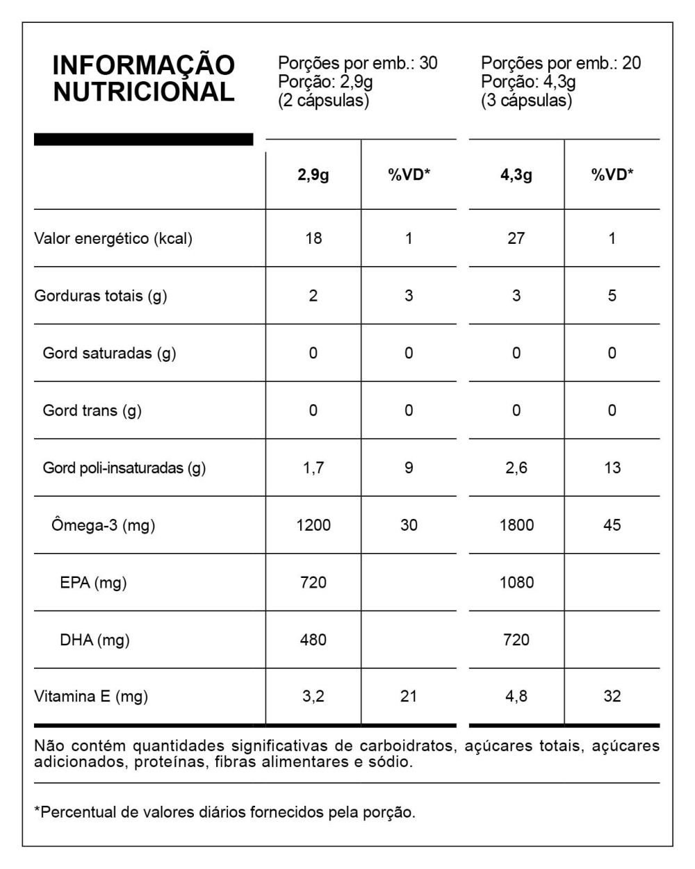 | Porção: 2,9g (2 cápsulas) | Porção: 4,3g (3 cápsulas) | |||